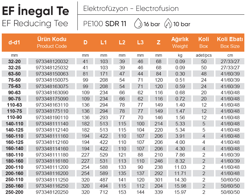 EF Reducing Tee; It is safely preferred in drinking water, natural gas, waste water and industrial fluid lines. It can be produced in different diameter combinations and project-specific sizes.