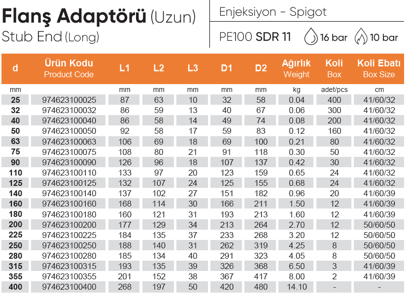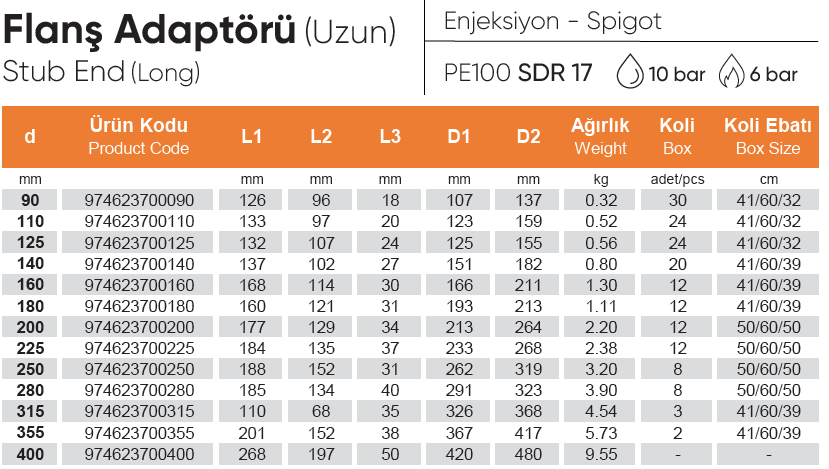 Flange Adapter – Long is a special fitting with a longer design than standard adapters used in HDPE (PE100) pipe systems to provide flanged connection with metal equipment, valves or different pipelines. Thanks to its long structure, it provides flexibility in pipelines, reduces stress at connection points and offers ease of installation. It is connected to the HDPE pipe by electrofusion or butt welding method, and the metal flange is designed in accordance with standard dimensions.